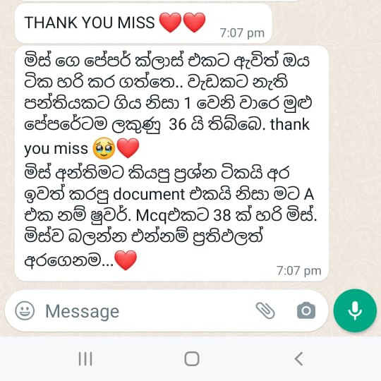 – විෂයය නිර්දේශ වෙනස්වීම්, ප්රශ්න පත්ර සඳහා පිළිතුරු ලියන ආකාරය මෙන්ම ලකුණු ලබා දෙන ආකාරය පිළිබඳ සිසුන්ට නිවැරදිම තොරතුරු ලබා දෙන විද්යාව පන්තිය වීම නිසාය.