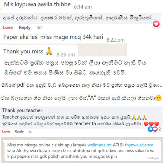 – අධ්යාපන අමාත්යංශයේ උපදෙස්, පුහුණුවීම් මගින් දරුවන්ට වඩාත් නිවැරදි විෂයය කරුණු ලබා දෙමින් විභාග සඳහා වඩාත් ගුණාත්මකව දරුවන් සූදානම් කරන විද්යාව පන්තිය නිසාය.