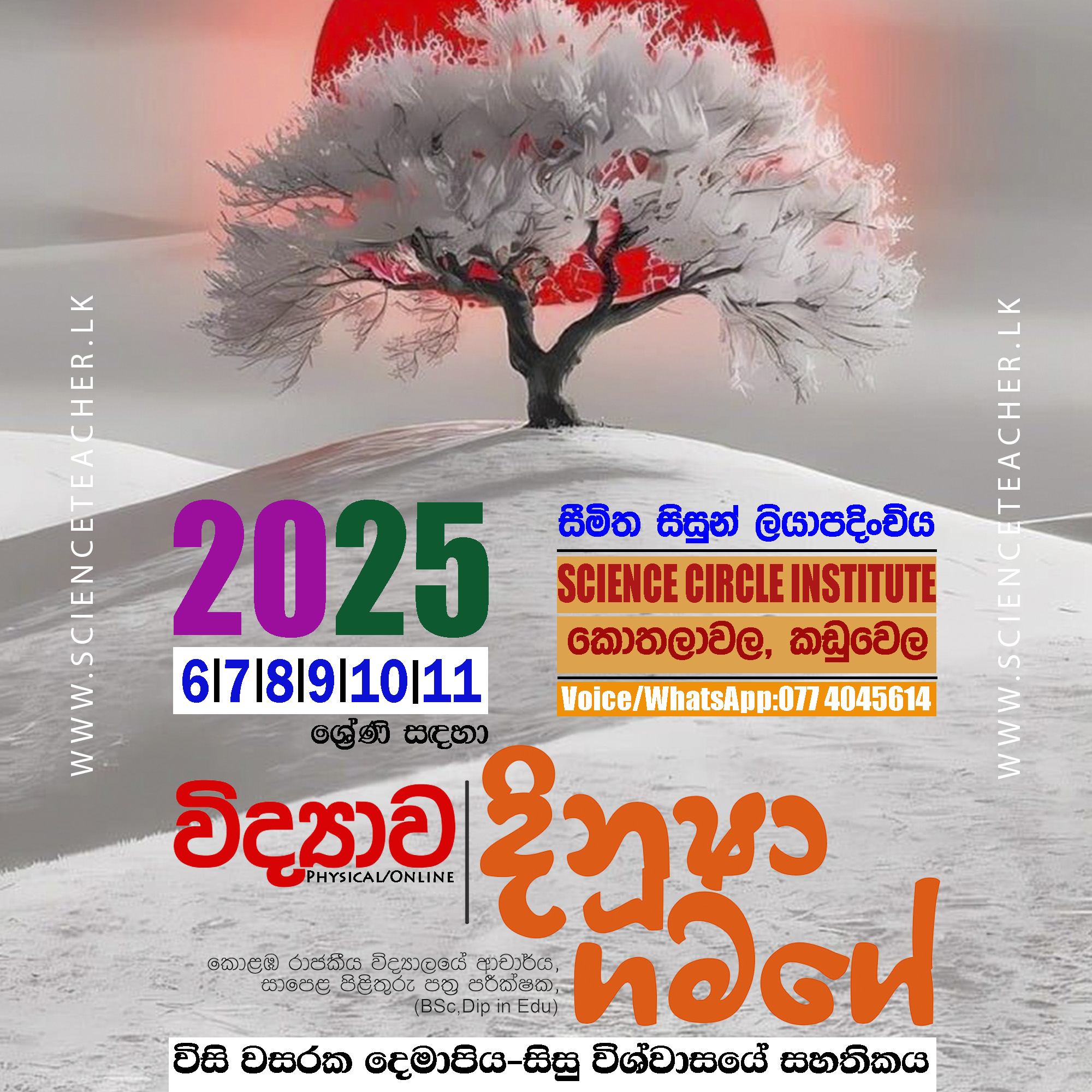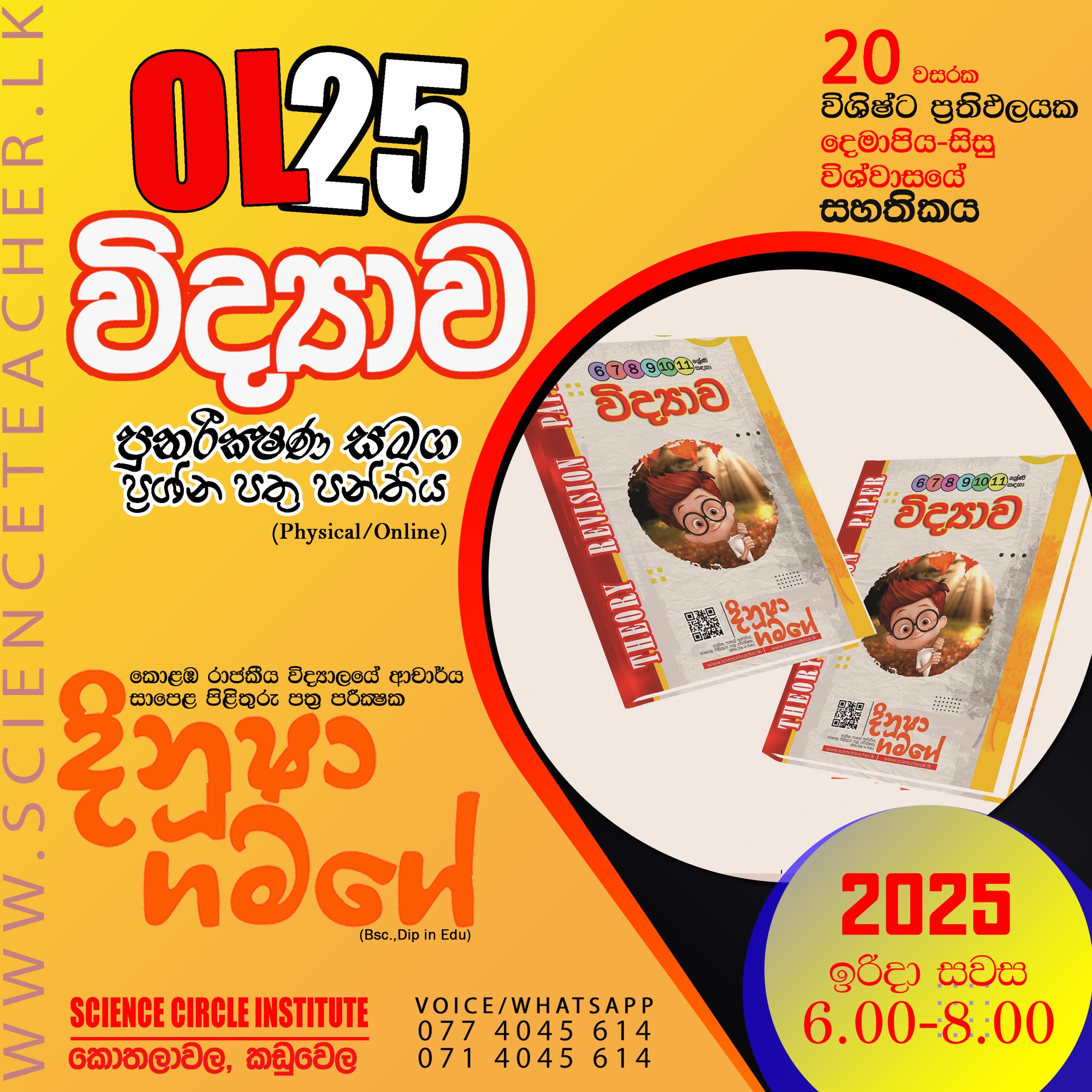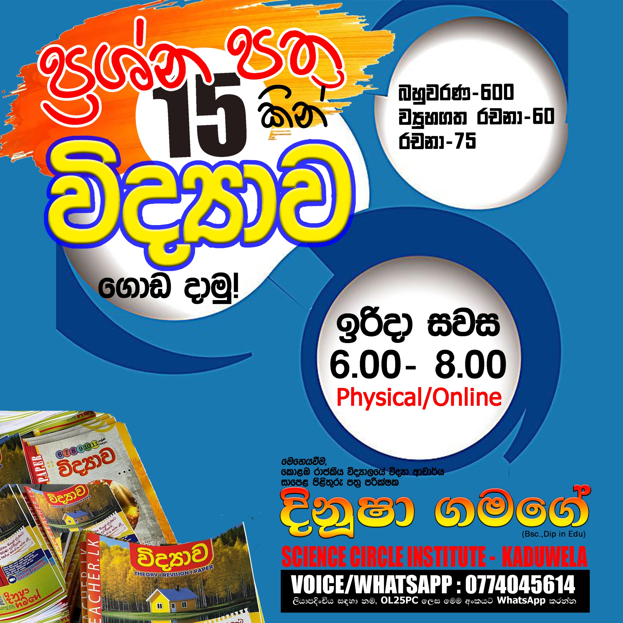 Physical/Online පන්ති සමග සම්බන්ධවීම සඳහා බස්නාහිර පළාතේ, කඩුවෙල, කොතලාවල පිහිටි SCI- Kaduwela (Science Circle Institute) ආයතනයට පැමිණ හෝ නම, ශ්රේණිය, පාසල, විද්යාව ලෙස සටහන් කර 077 4045614 ට WhatsApp කිරීමෙන් අවශ්ය විස්තර ලබා ගෙන පන්ති සමග සම්බන්ධවිය හැකිය.