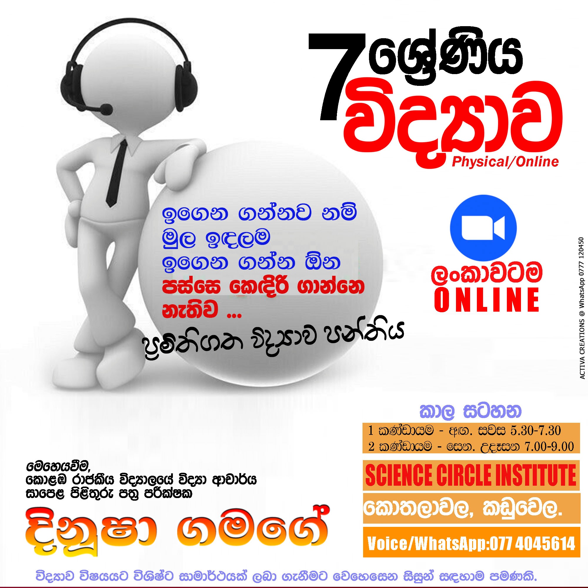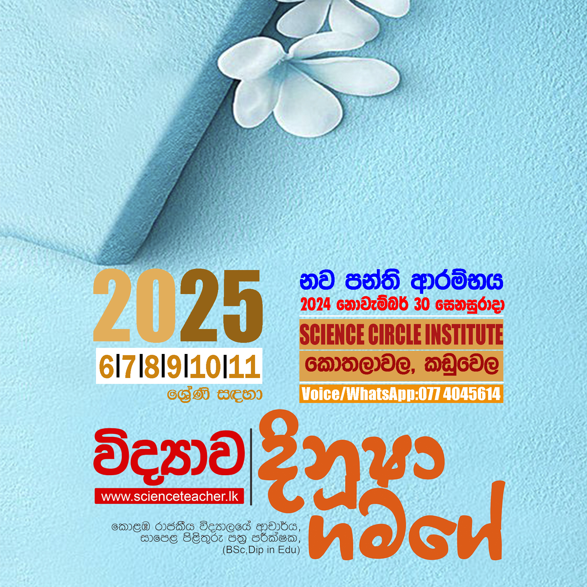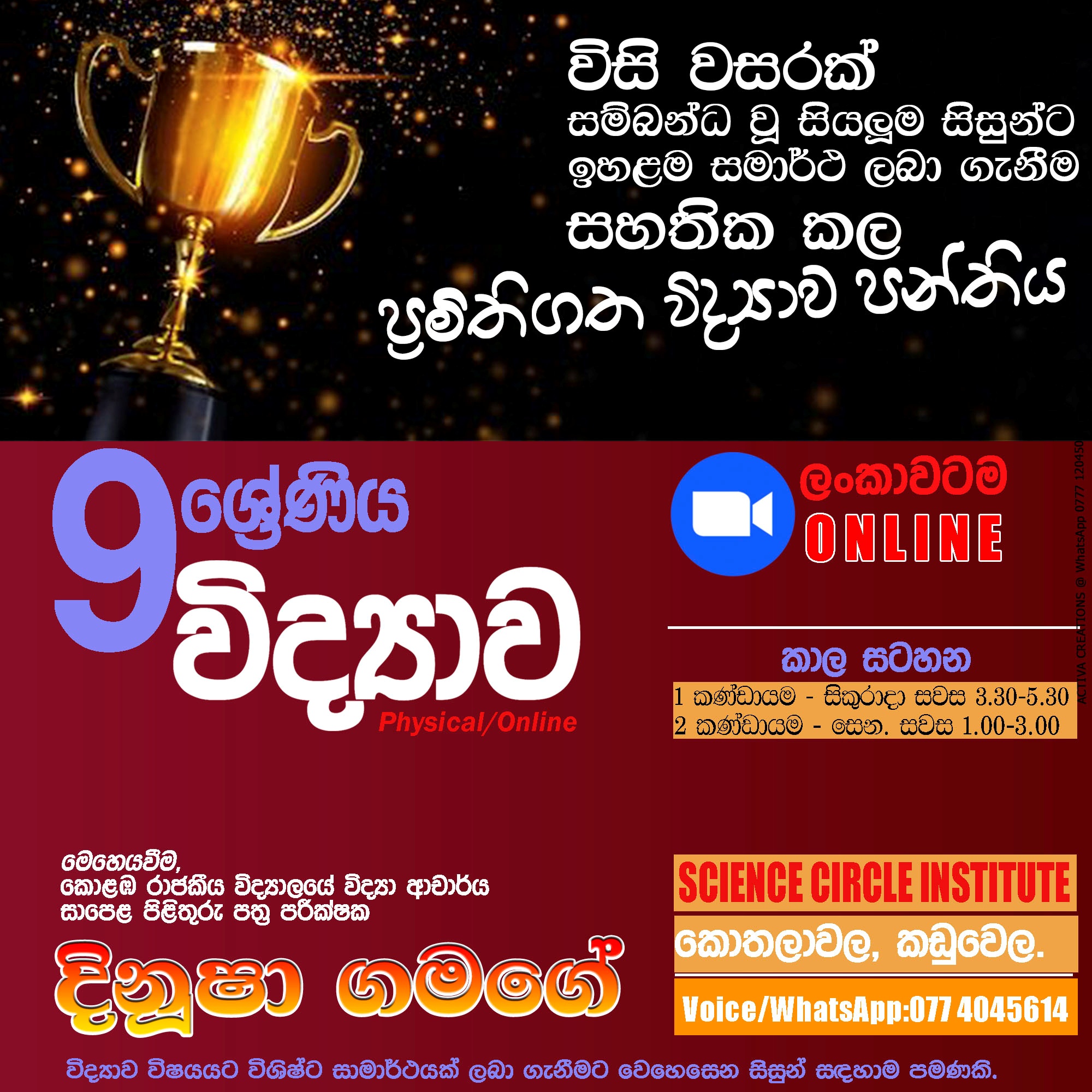 Physical/Online පන්ති සමග සම්බන්ධවීම සඳහා බස්නාහිර පළාතේ, කඩුවෙල, කොතලාවල පිහිටි SCI- Kaduwela (Science Circle Institute) ආයතනයට පැමිණ හෝ නම, ශ්රේණිය, පාසල, විද්යාව ලෙස සටහන් කර 077 4045614 ට WhatsApp කිරීමෙන් අවශ්ය විස්තර ලබා ගෙන පන්ති සමග සම්බන්ධවිය හැකිය.